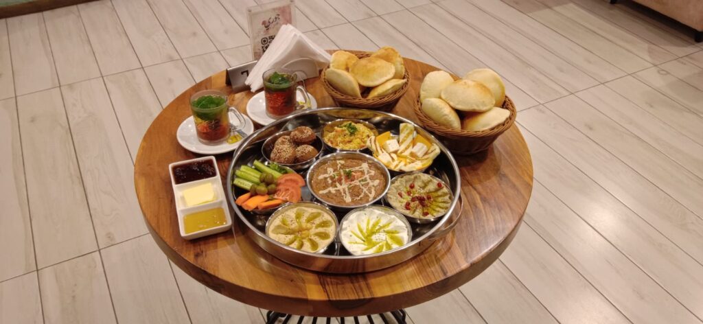 Falafel Fresh Salad Houmous Labneh Motabal Mix cheese Sakshuka Foul Butter,jam & honey Kubos