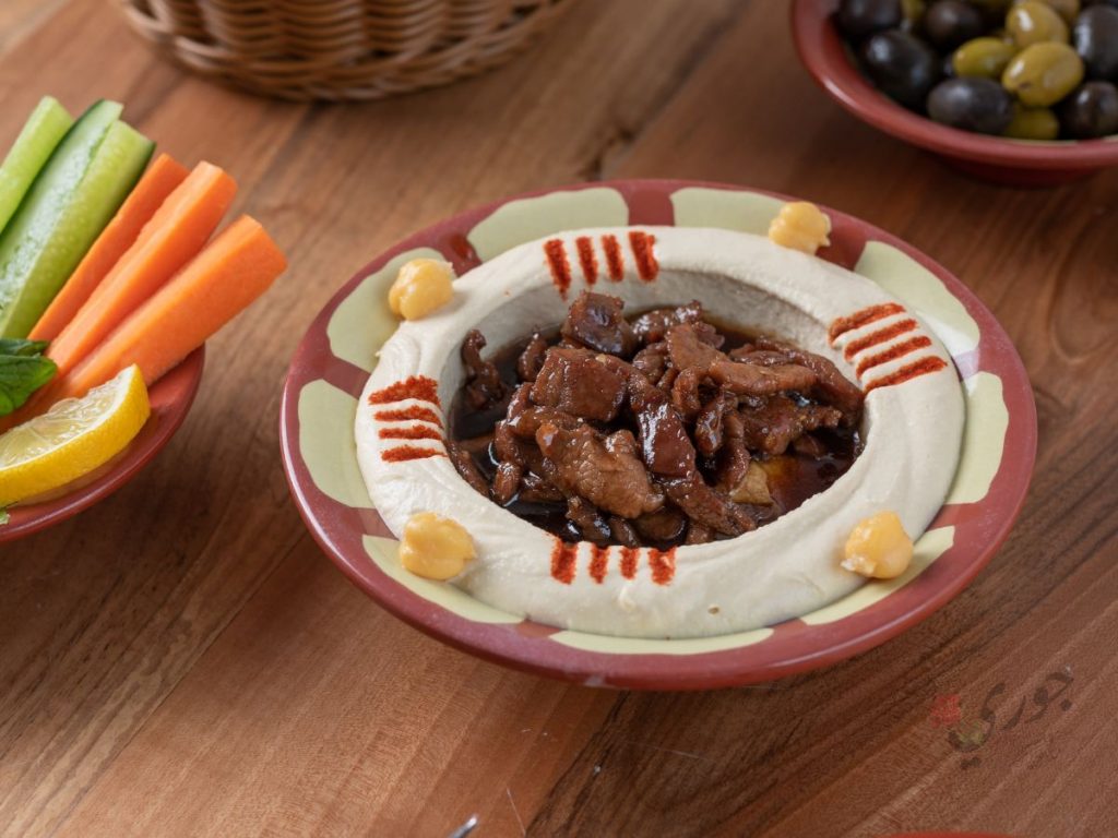 حمص ، زيت زيتون ، طحينة ، لحم مع / صلصة رمان