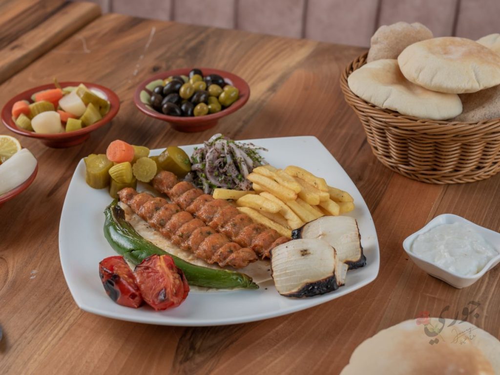 كفتة دجاج ، مخلل مشكل ، بطاطس ، طماطم ، بصل أخضر حار ، صلصة الثوم على الجانب