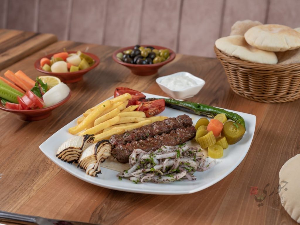 كفتة ، مخلل مشكل ، بطاطس ، طماطم ، بصل أخضر حار ، صلصة ثوم على الجانب