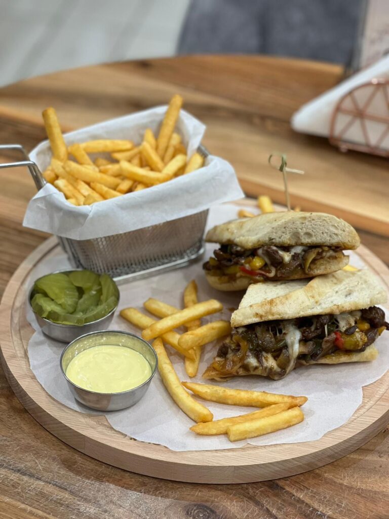 Baguette bread stuffed with beef strips mixed with mushroom, onion, capsicum, barbecue sauce and mozzarella cheese. Served with french fries and american pickles